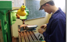 PRACOWNIA OBRÓBKI MECHANICZNEJ Uczniowie w pracowni obróbki mechanicznej poznają i nabywają umiejętności z zakresu obsługi i wykonywania podstawowych operacji obróbki skrawaniem na tokarce, przecinarce ramowej, wiertarce stołowej i kolumnowej oraz frezarce. [Show slideshow]